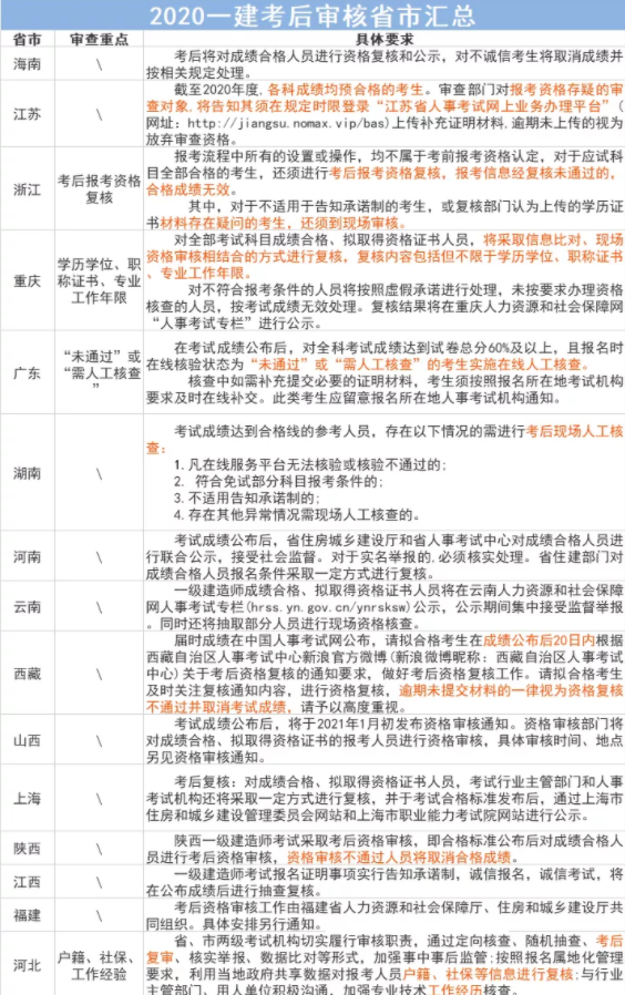 4、选择“一级建造师”,点击“查询”按钮即可查询分数 *因为集中查分人群太多,官网出现短时间崩溃,暂时无法查询的考生可以稍等一段时间,网络不那么拥挤的时候再进行查分。 重要提醒! 江苏 山西 湖南 这12个地区的考生需要进行资格后审 请在规定时间内完成! 附各省审核表